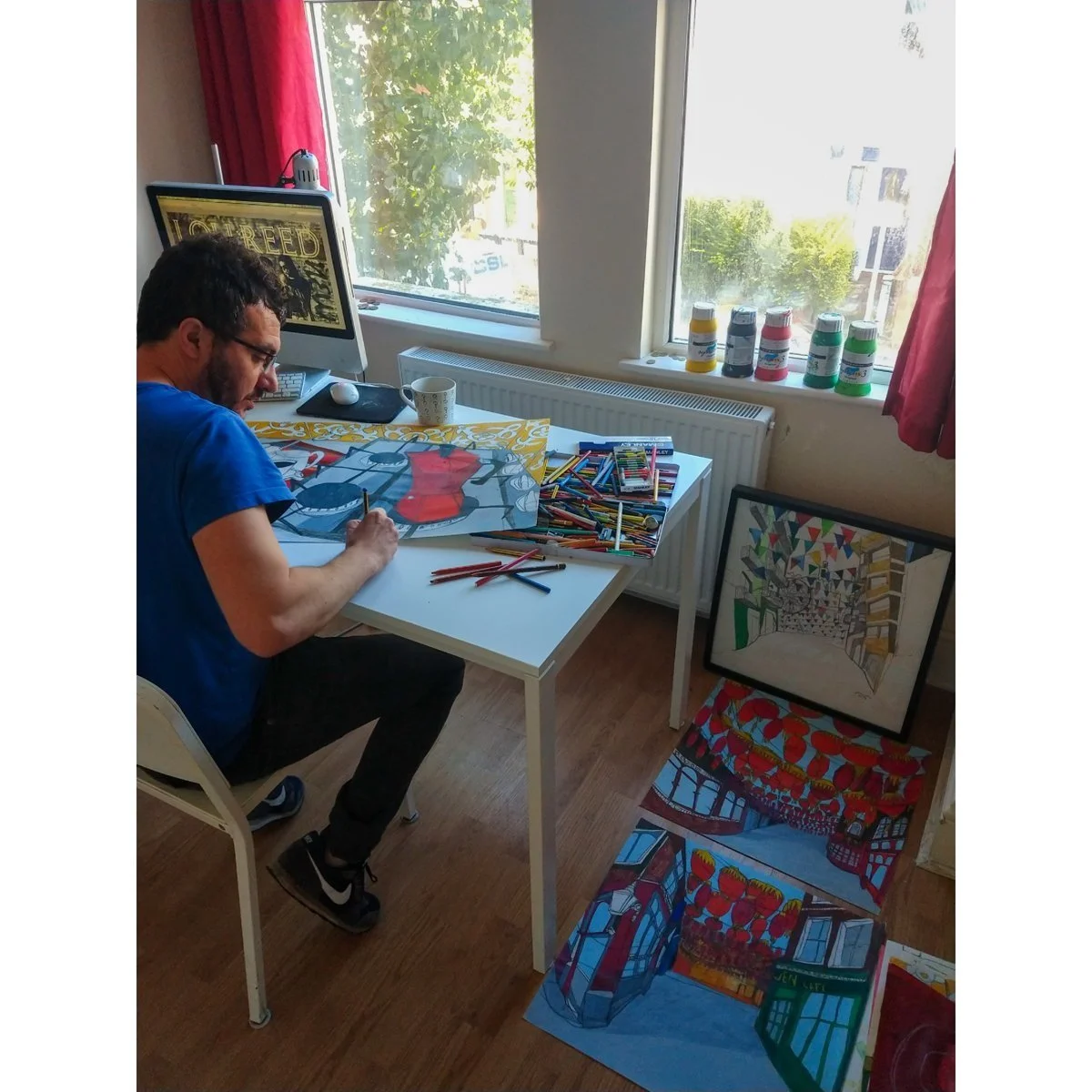 I work from both observation and memory, paying attention to small details that allow each line to convey the warmth of a lived moment. I primarily use coloured pencils and acrylics on paper.